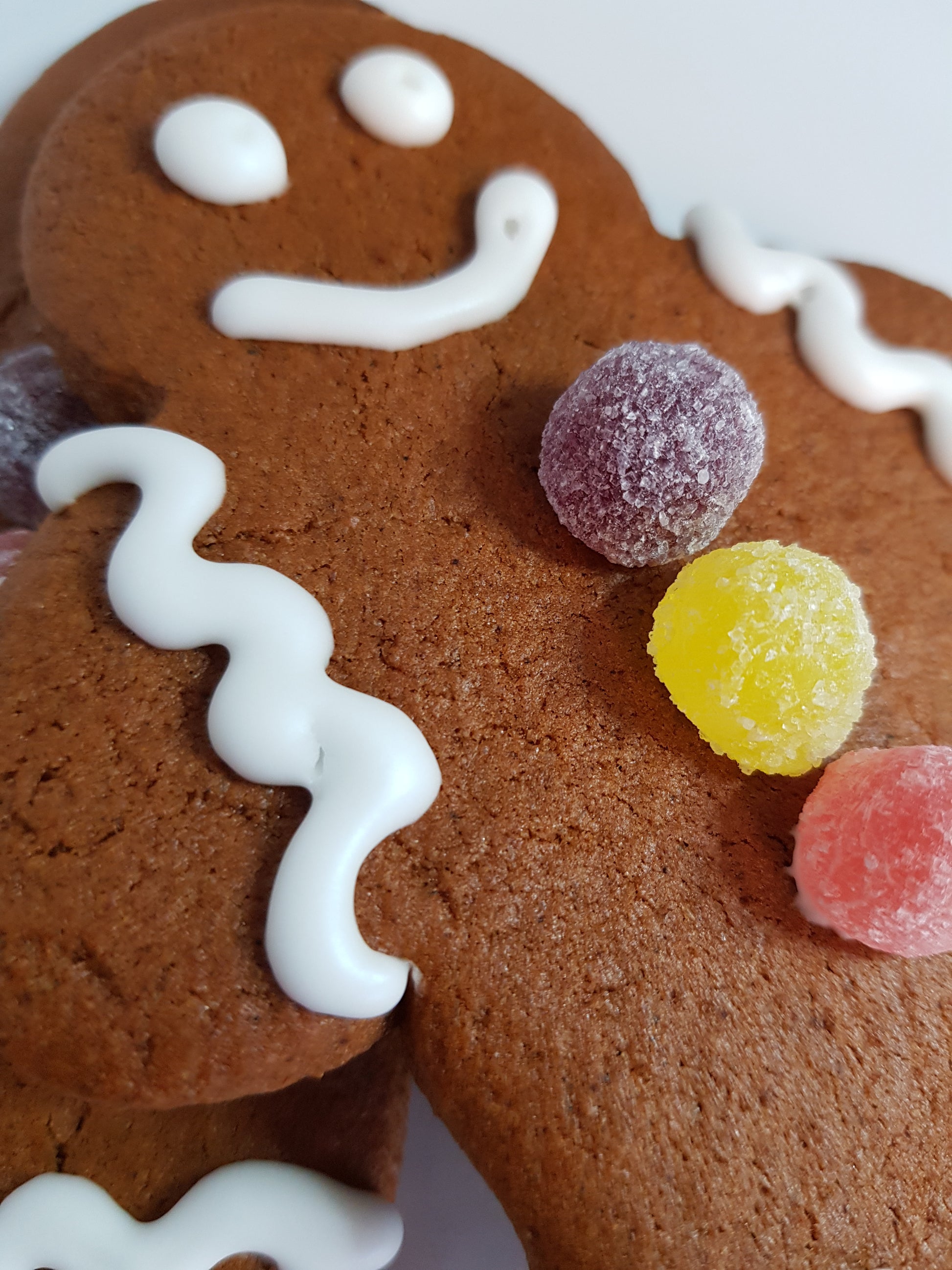 Gingerbread Men: (Dark Brown Sugar) Sugar Cane, Cane Molasses (Golden Syrup) Partially Inverted Refiners Syrup (Butter) Cream (Cows' Milk) Minimum 80% Milk Fat. (Plain Flour) Fortified British Wheat Flour (Wheat Flour, Calcium Carbonate, Iron, Niacin, Thiamin). (Bicarbonate of Soda) Raising Agent:Sodium Hydrogen Carbonate. (Ground Ginger) (Ground Cinnamon) (Egg) Egg, (Icing Suagr) White Cane Sugar (97%), Anti Caking Agent: Maize Starch. (Jelly Tots) Sugar, Glucose Syrup, Starch, Acids (Malic Acid, Citric Acid, Lactic Acid, Acetic Acid), Concentrated Fruit Juices (Apple, Blackcurrant, Lime, Orange, Strawberry, Lemon), Acidity Regulator (Trisodium Citrate), Flavourings, Colours (Anthocyanins, Copper Complexes of Chlorophyllins, Beta-carotene, Curcumin)